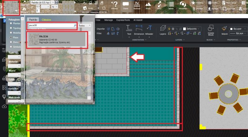Al final de los suelos, trabajaremos primero con el borde de nuestra piscina y elegiremos un suelo para nuestro borde. En este ejemplo utilizaremos el suelo Atlantis HD, que en nuestro catálogo tiene el código PA.CE36, y contornearemos nuestro borde.