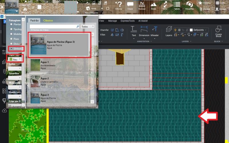 Por último, la parte que hace que la piscina sea lo que realmente es: el agua. Iremos a la pestaña Símbolos y elegiremos un agua. Después, cubriremos todo el polígono de nuestra piscina con ella.