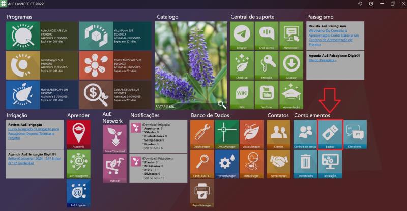 Con AuE LandOFFICE abierto, ve a la sección de complementos y haz clic en Copia de seguridad.