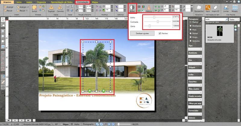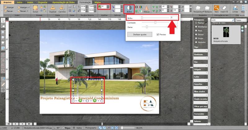 Ajuste la perspectiva según la posición de la sombra en la imagen original. Después de definir la perspectiva, reduzca el brillo y ajuste la opacidad del elemento hasta que se parezca visualmente a una sombra real.