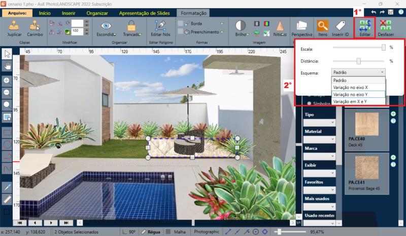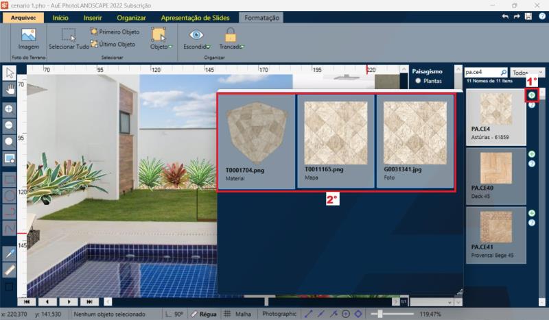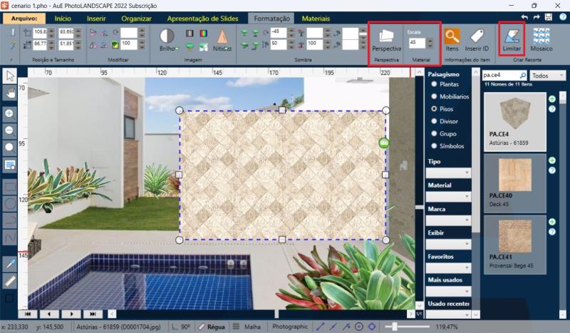 Con el proyecto abierto, cree el polígono.Seleccione la opción piso y elija el piso deseado, en el ícono «+» elija el Material.Ajuste el tamaño del material según el polígono, se puede ajustar libremente en cualquier dirección, sin distorsión, ya que está compuesto por repeticiones del mapa.Utilice el control de Escala para aumentar o reducir el patrón según el tamaño del área. En la pestaña de formato, haga clic en Limitar y seleccione el área interna del polígono.El material se aplicará respetando los contornos del área.