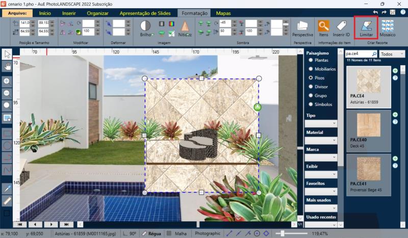 Con el proyecto abierto, cree el polígono.Seleccione la opción piso y elija el piso deseado, en el ícono "+" elija el mapa deseado.Ajuste el tamaño del mapa según el polígono, redimensionando solo por las diagonales para mantener la proporción correcta.En la pestaña de formato, haga clic en Limitar y seleccione el área interna del polígono.El mapa se aplicará respetando los contornos del área.