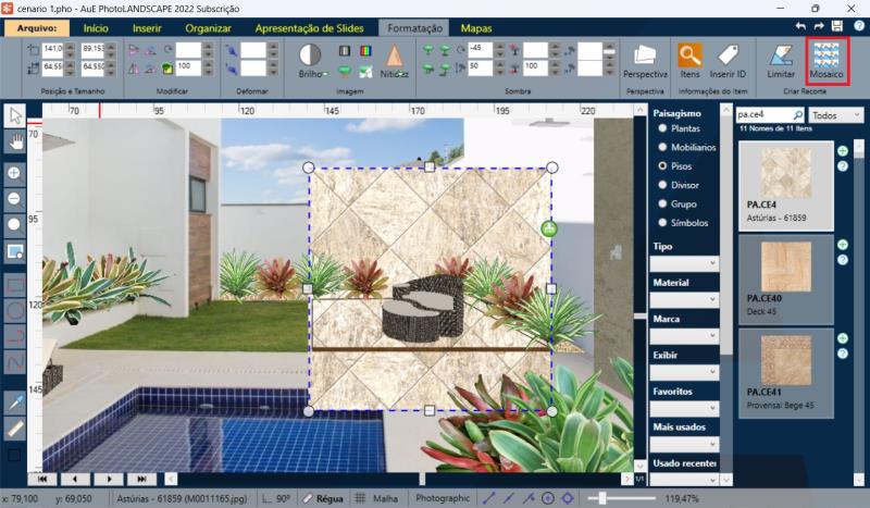Importante: El modo Mosaico simula el comportamiento del Material, repitiendo el mapa automáticamente y permitiendo ajustes de proporción y espaciado en las variaciones de la repetición.