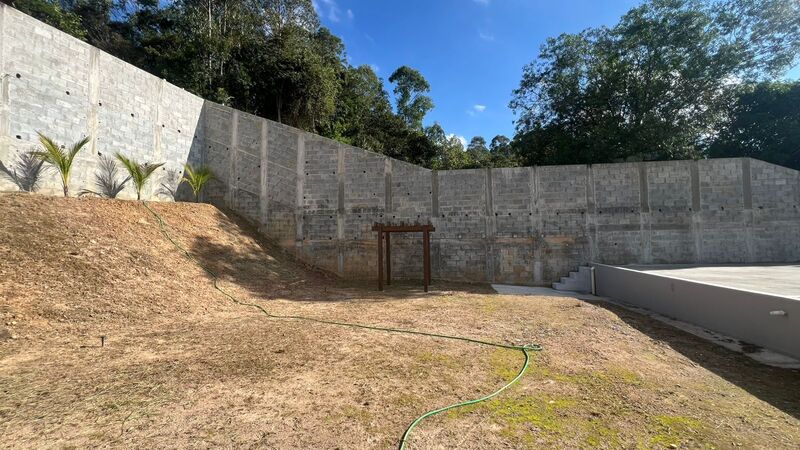 El proyecto se llevó a cabo en un condominio ubicado a solo 5 km de su tienda, en un amplio terreno dentro de una zona de conservación de la Mata Atlántica. El terreno presentaba una pronunciada pendiente y estrictos requisitos ambientales, como la preservación de parte de la vegetación autóctona. Incluso después de finalizar los trabajos de movimiento de tierras, al propietario le resultó difícil decidir dónde ubicar la residencia, la zona de ocio, el jardín y la piscina sin comprometer el entorno natural.
