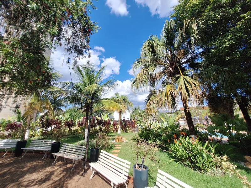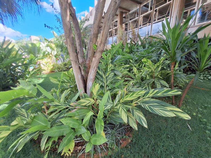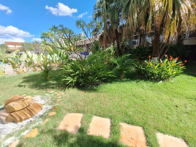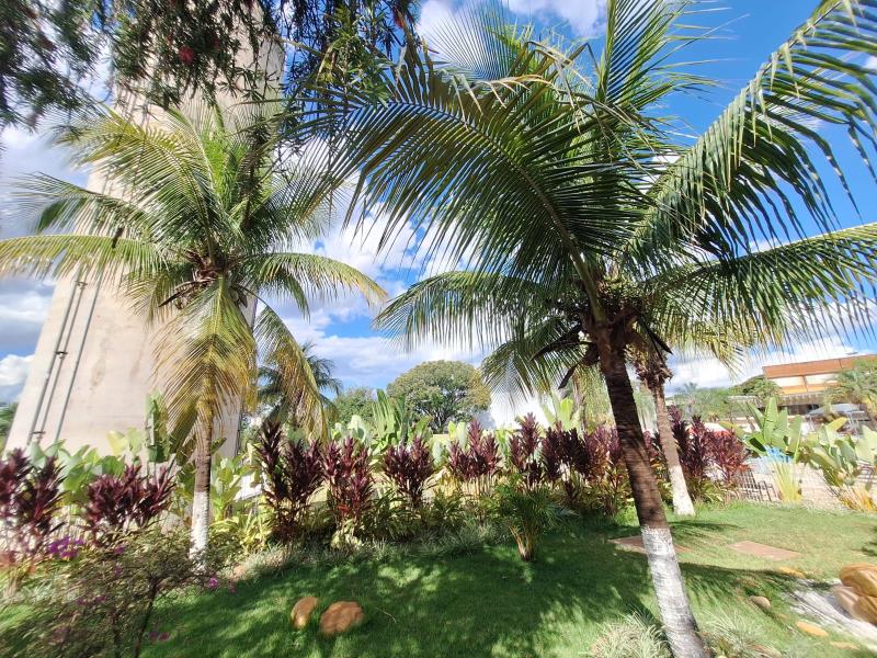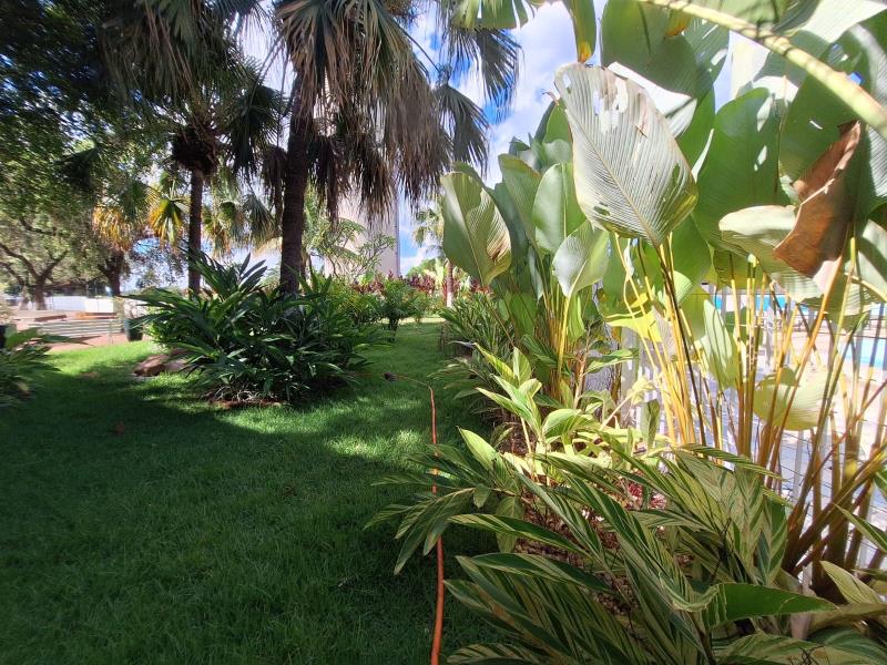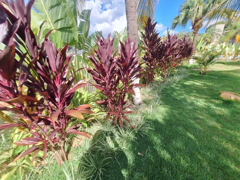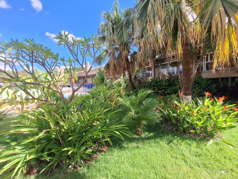 El jardín, de unos 300 metros cuadrados, está situado entre la escuela y el club asociado a la institución. Antes de la intervención paisajística, el lugar presentaba un escenario bastante limitado: solo había césped ralo y algunas palmeras altas remanentes de la época de la construcción, sin composición vegetal ni estructura que valorizara el espacio.